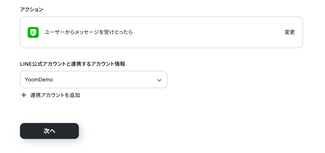 LINE公式アカウントと連携するアカウント情報に誤りがないかを確認し、アクションは「ユーザーからメッセージを受けとったら」のままで「次へ」をクリックします。