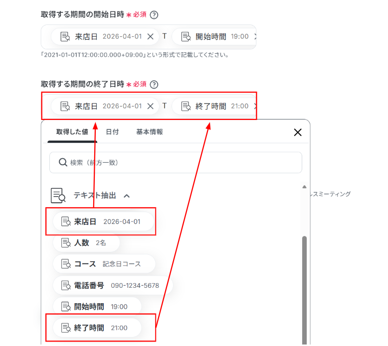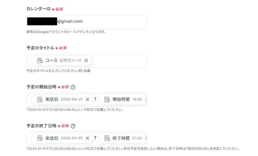 下の画像では、「指示内容」にGoogleカレンダーで日時を登録する際に「YYYY-MM-DDT00:00:00+00:00」の形式で読み込むため、「YYYY-MM-DD」に変換するように指示しています。