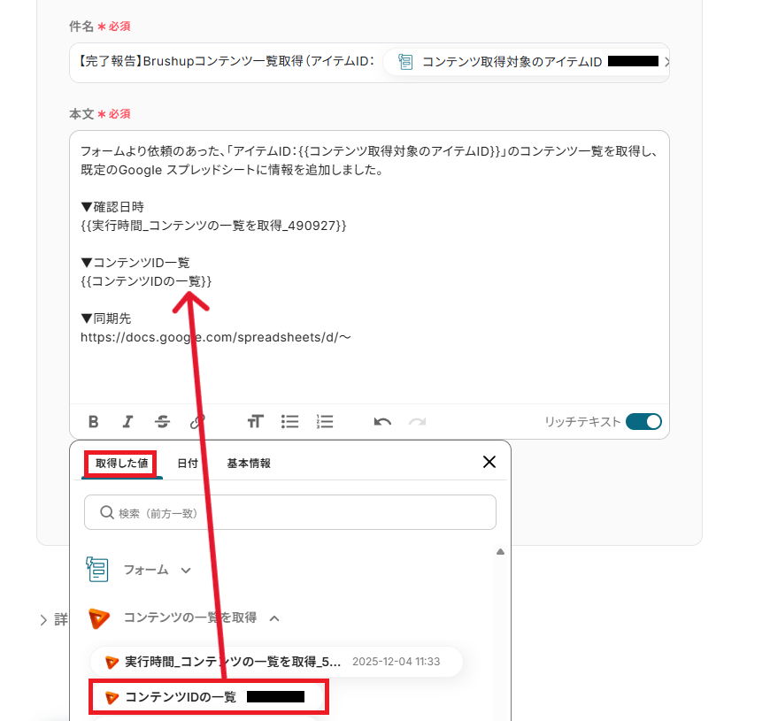 「件名」と「本文」は、下図のように取得した値を活用して自由に入力できます。