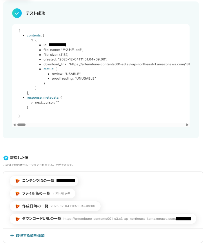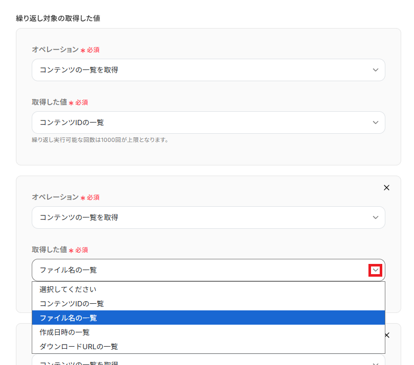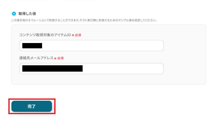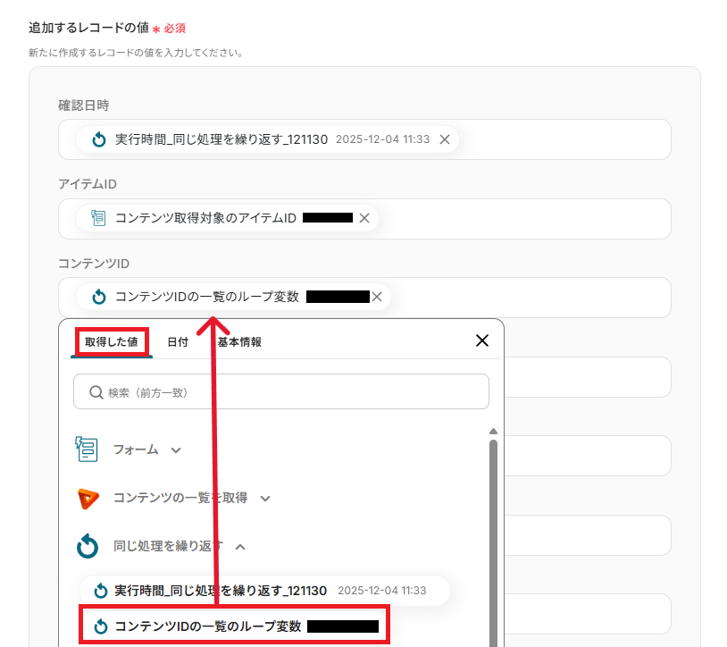 「取得した値」には、ループ処理で用いるレコードの項目(コンテンツの一覧やファイル名の一覧)を設定し、最後に「完了」をクリックしてください。