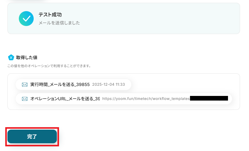 確認できたら、Yoomに戻り「完了」を押してください。