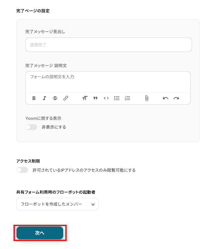 下へスクロールすると、「完了ページの設定」が表示されます。