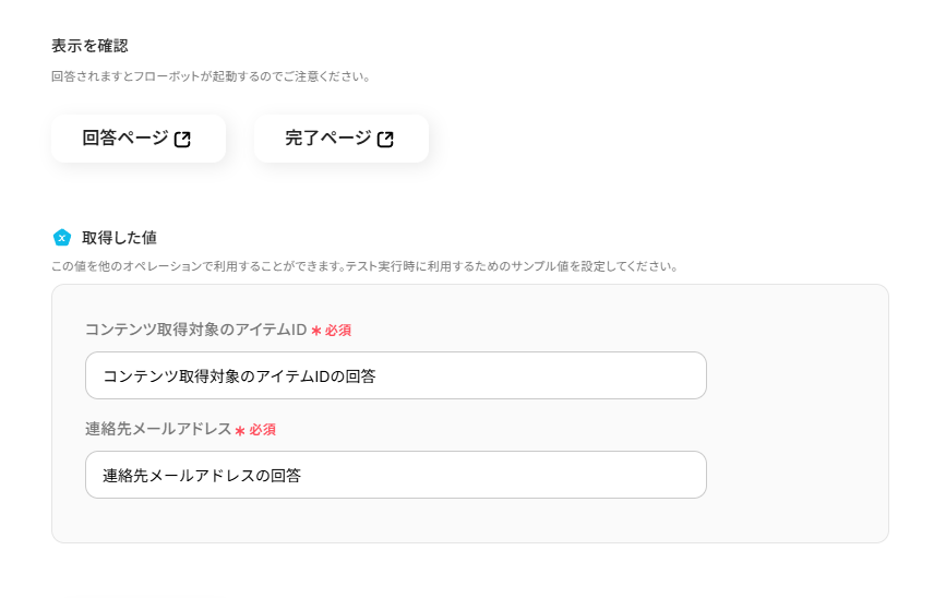 「アイテムID」と「確認希望者の連絡先」は取得した値の【フォーム】から引用し、それ以外の項目は、取得した値の【ループ変数】を引用し設定してください。