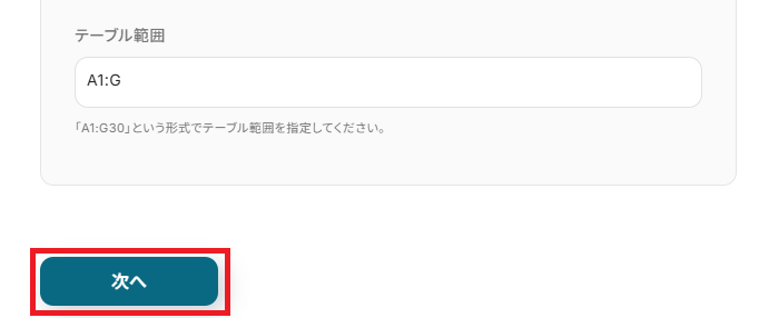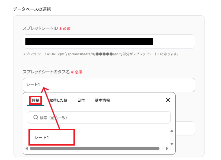 「スプレッドシートID」と「スプレッドシートのタブ名」は、入力欄をクリックして表示される候補から作成したシートを選択してください。
