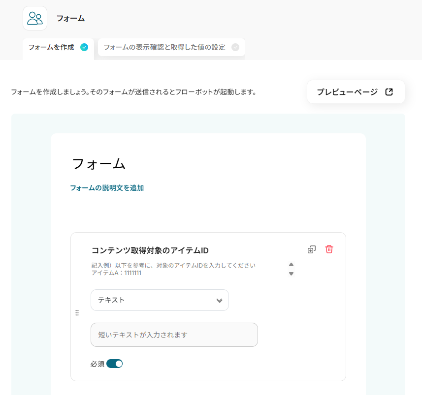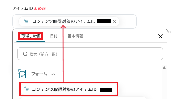 「アイテムID」を取得した値を引用し設定してください。