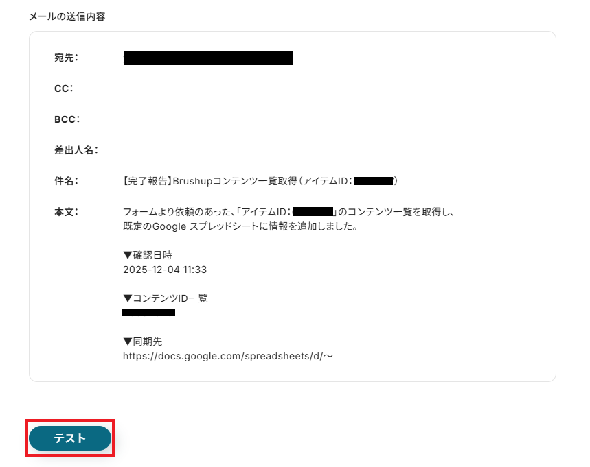 内容に誤りがないか確認し、問題なければ「テスト」を押してください。