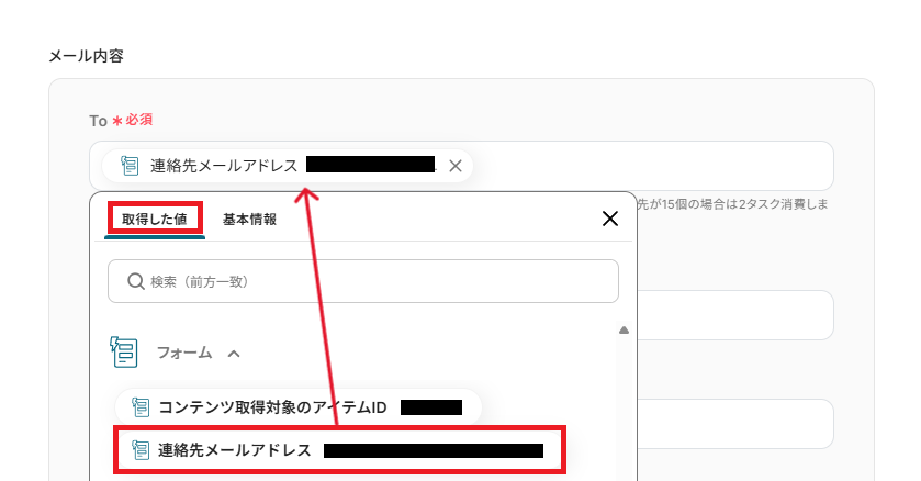 「To」は、取得した値を引用し設定してください。