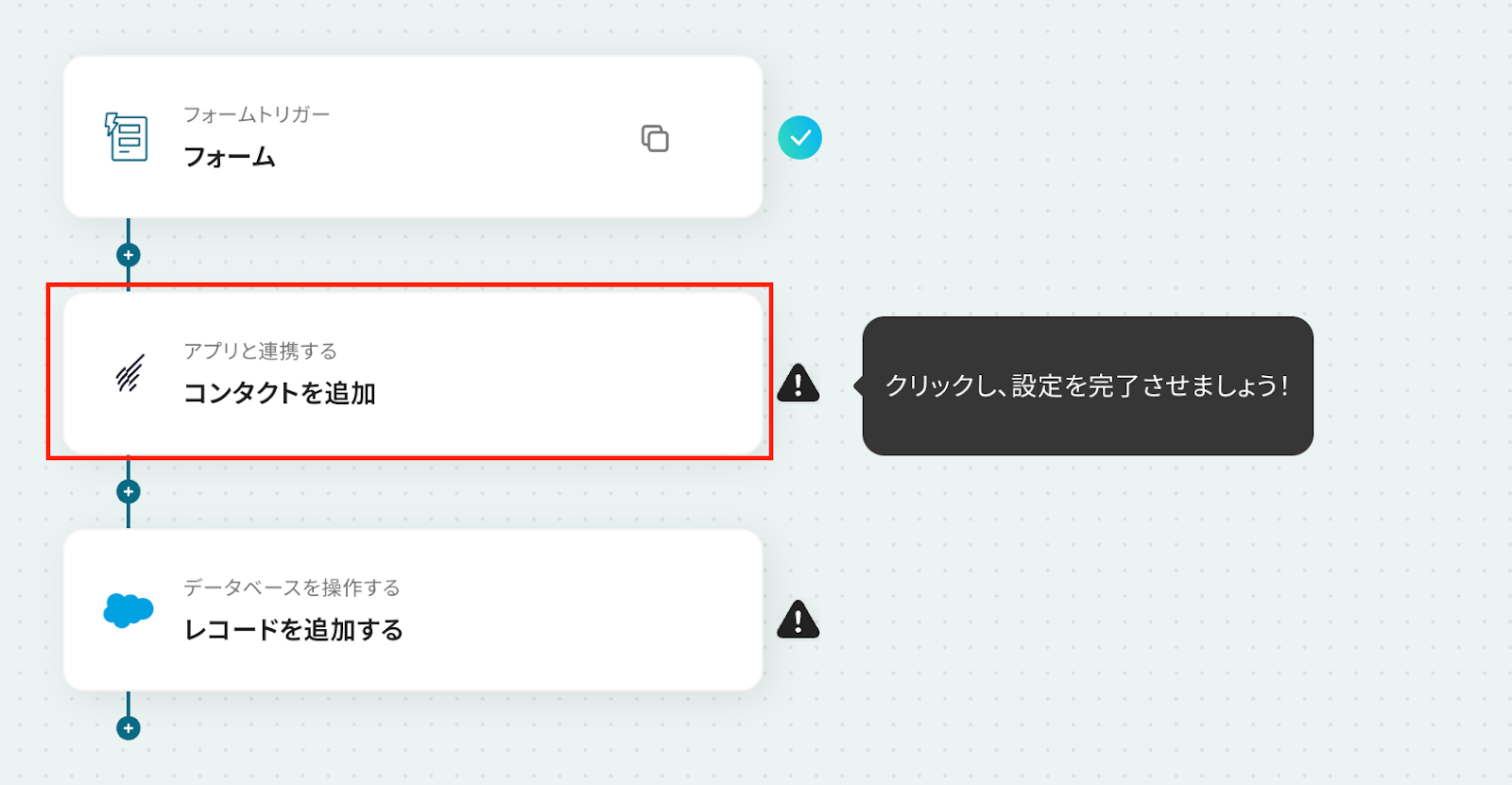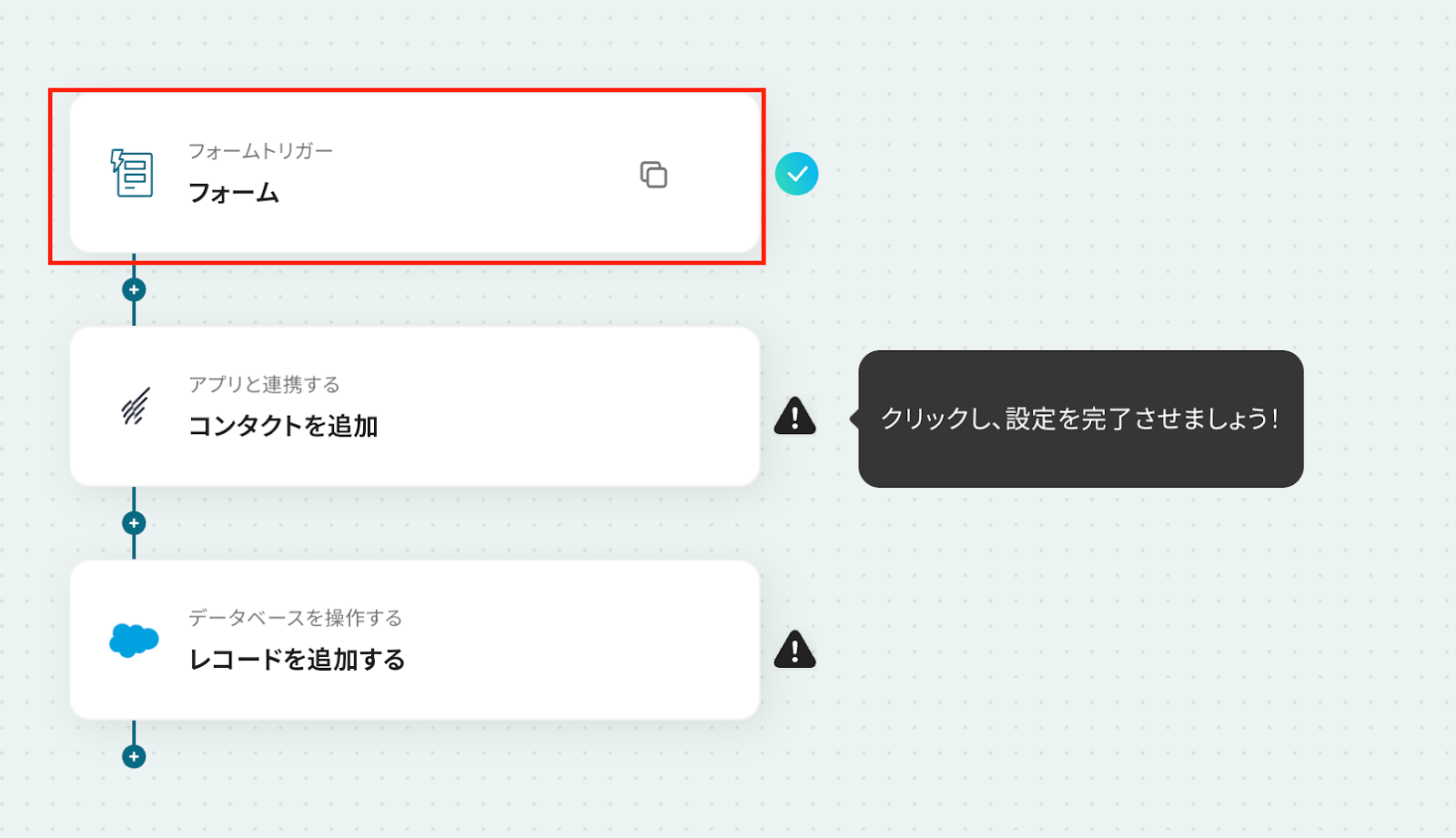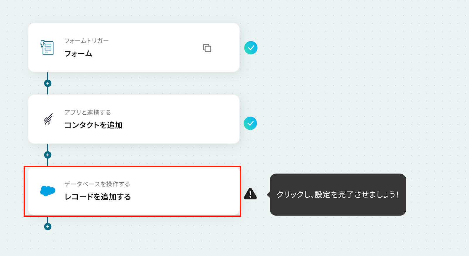 Salesforceは、チームプラン・サクセスプランをご利用の方向けのアプリです。 フリープランやミニプランで使うと、フローボットのオペレーションやデータコネクトがエラーになってしまうのでご注意ください。 また、有料プラン(チームプラン・サクセスプラン)には2週間の無料トライアルがあります。 トライアル期間中は、普段は制限されているSalesforceも問題なくお試しいただけますので、ぜひこの機会にいろいろと体験してみてくださいね!