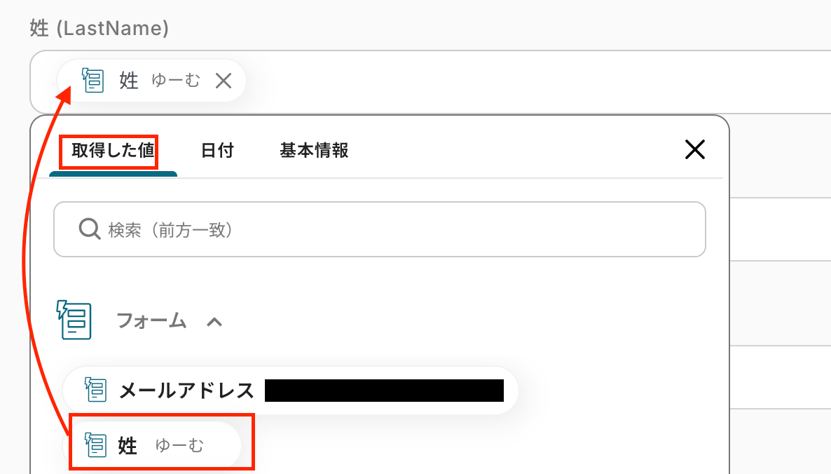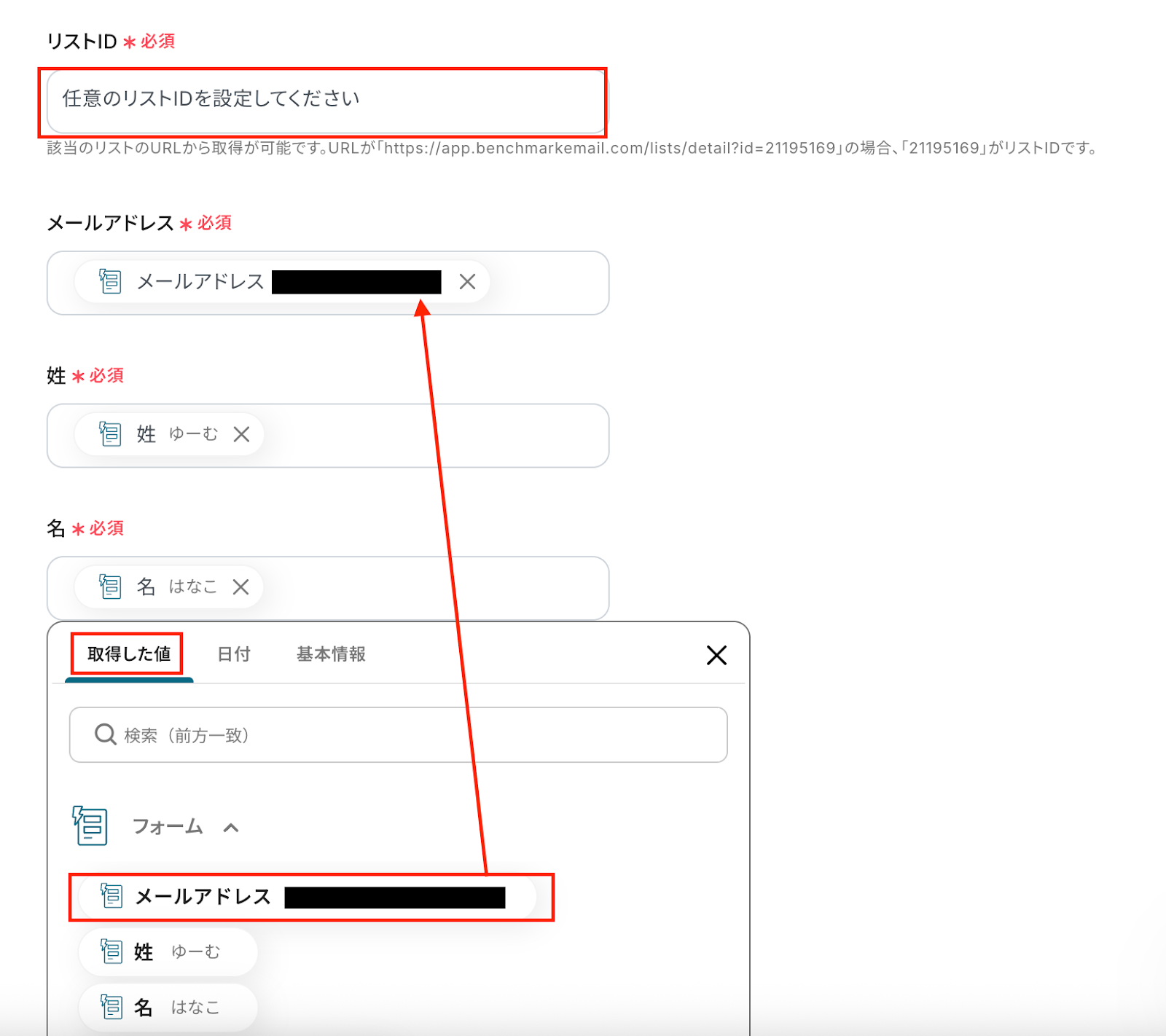 メールアドレス、姓、名は添付した画像のようにフォームの「取得した値」の項目からそれぞれ選択してください。 このように「取得した値」を使って設定することで、フローが起動するたびに、最新のフォームの回答データを引用できるようになります。 なお、直接入力してしまうと”固定値”となり、毎回同じ値が繰り返しBenchmark Emailに追加されてしまうため、ご注意ください。 設定後、テストをクリックしましょう。