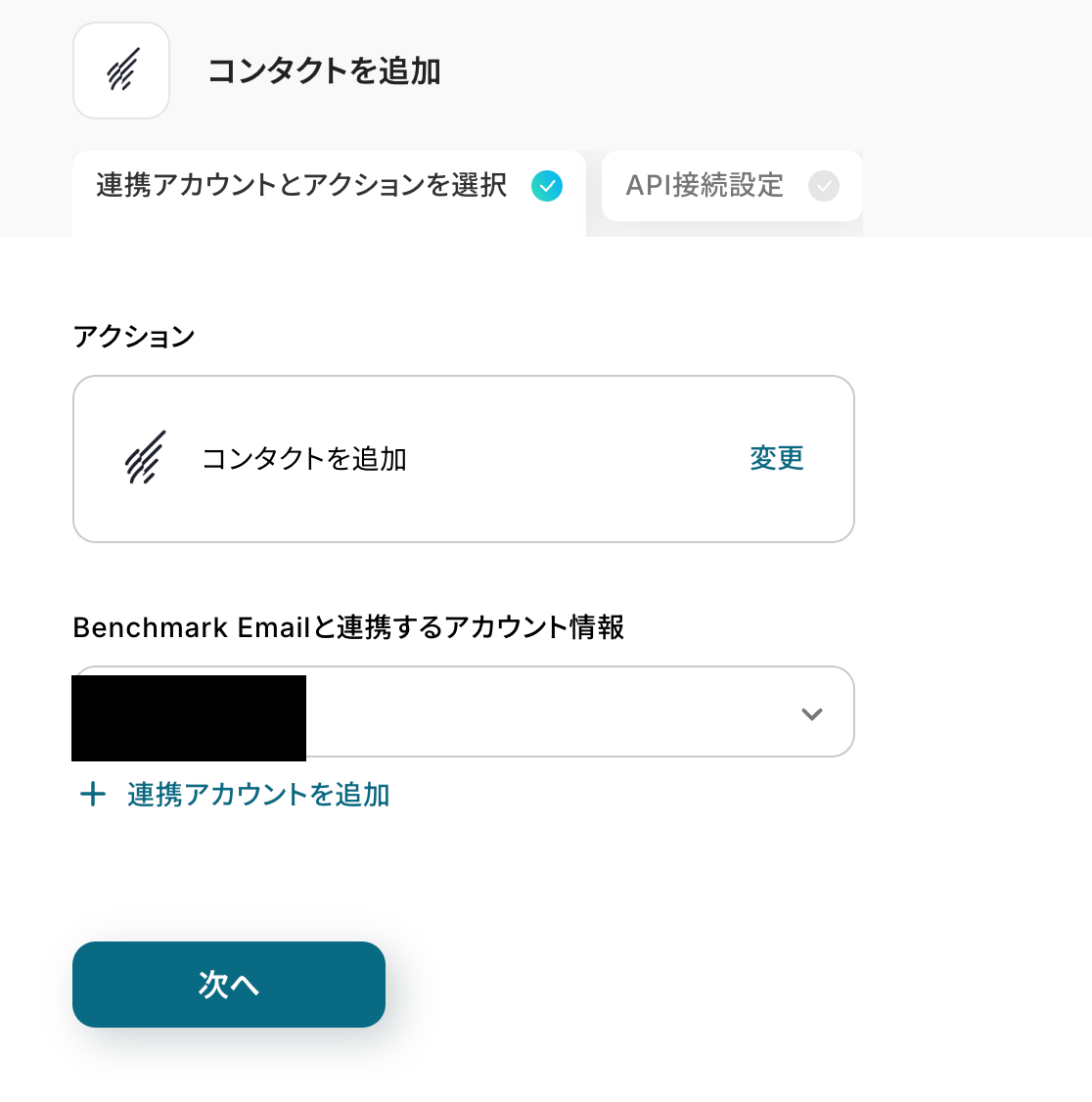 こちらの画面が設定済みですので、Benchmark Emailと連携するアカウント情報が連携したいアカウントになっているか確認後、次へをクリックしてください。