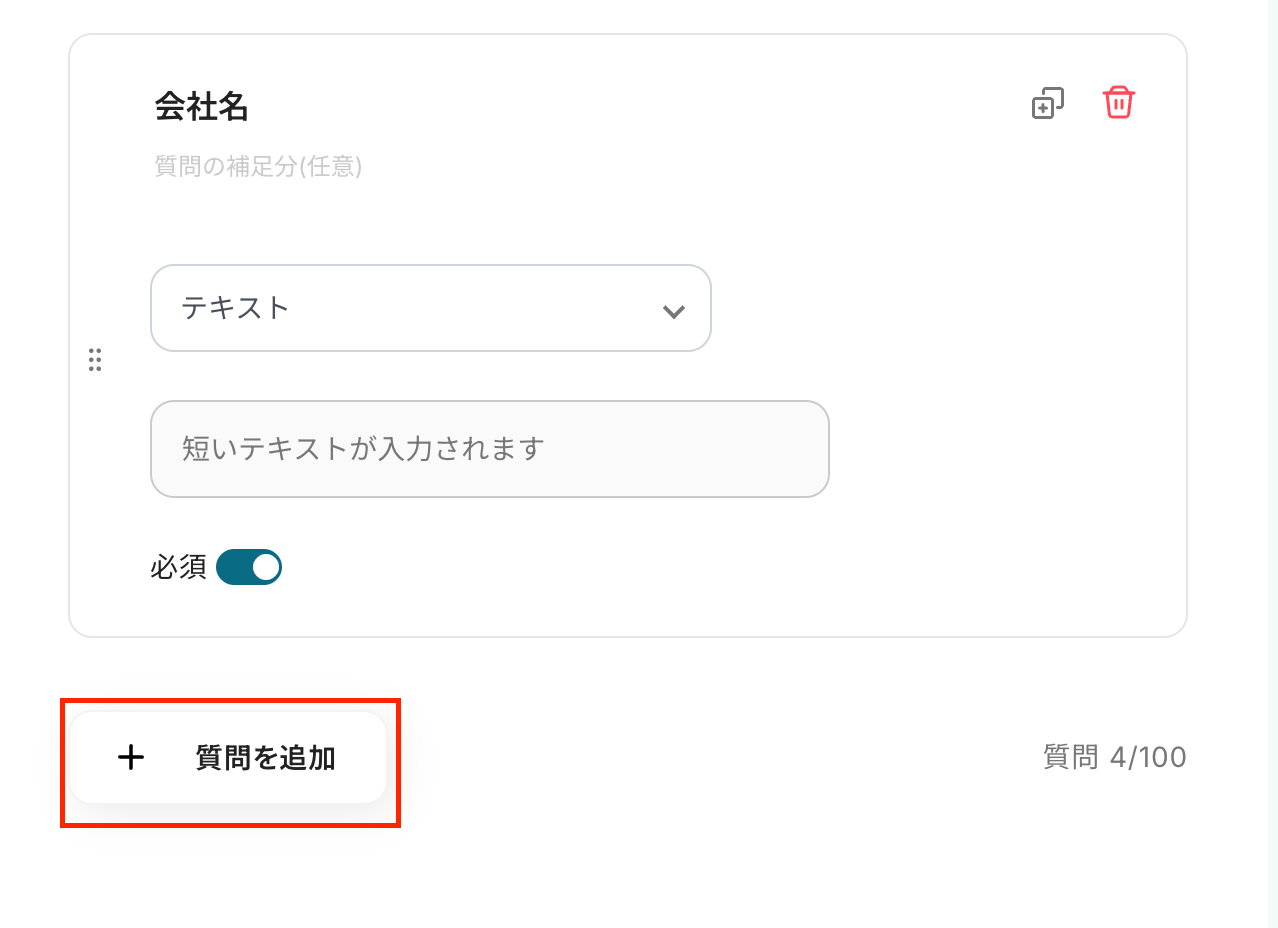 もし追加で質問項目を増やしたい場合は「質問を追加」を選択し、設定しましょう。