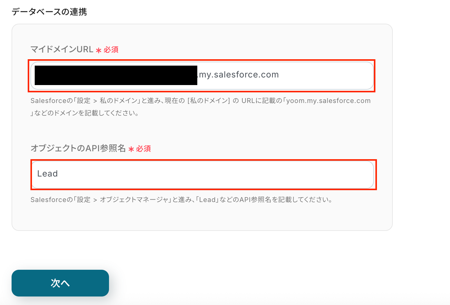 マイドメインURLは注釈を確認して設定してください。 オブジェクトのAPI参照名は任意で選択し、次へをクリックしましょう。