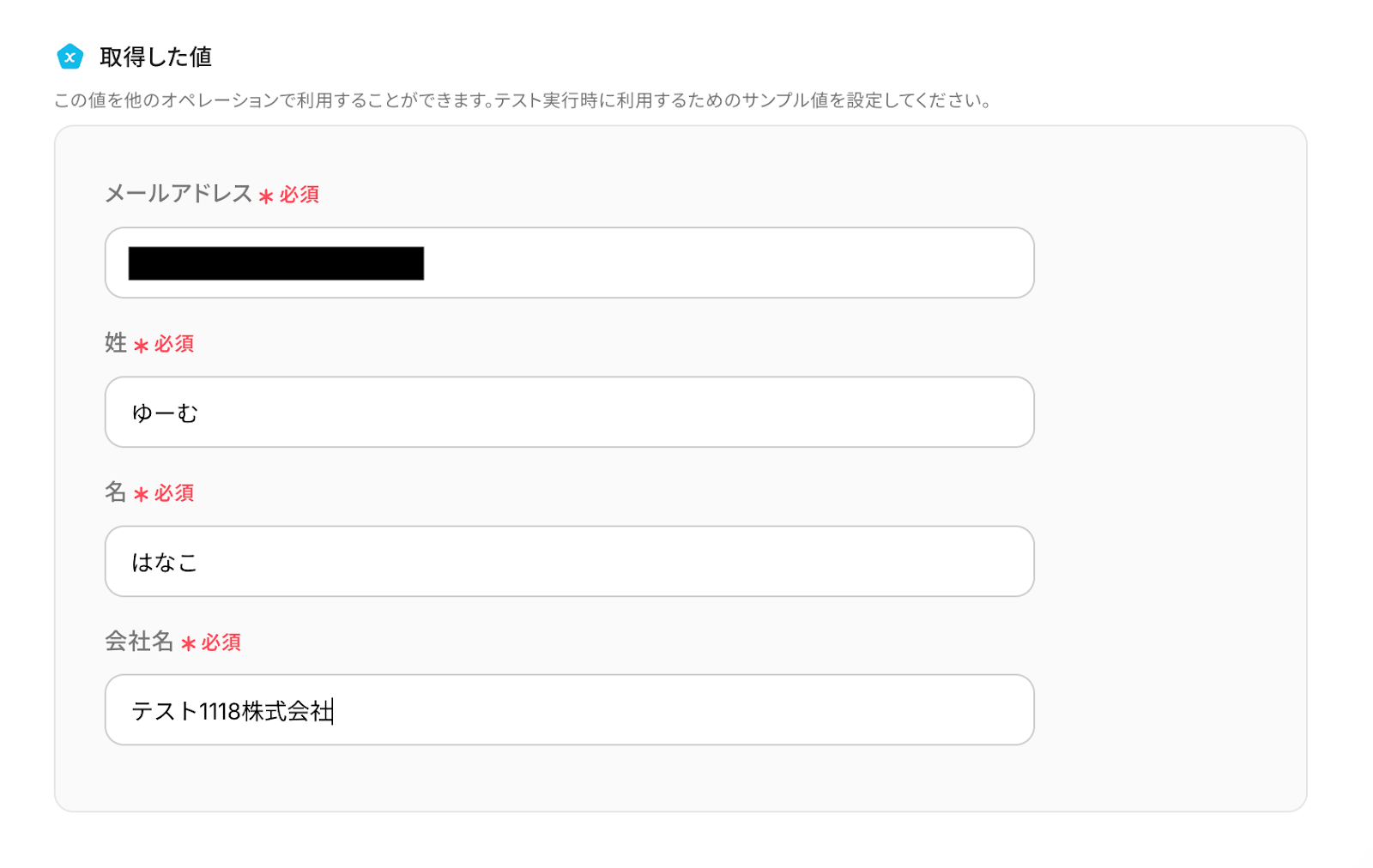 次に、「取得した値」にフォームの回答内容のサンプル値を設定します。 この値を次のオペレーションで引用していきますよ!
