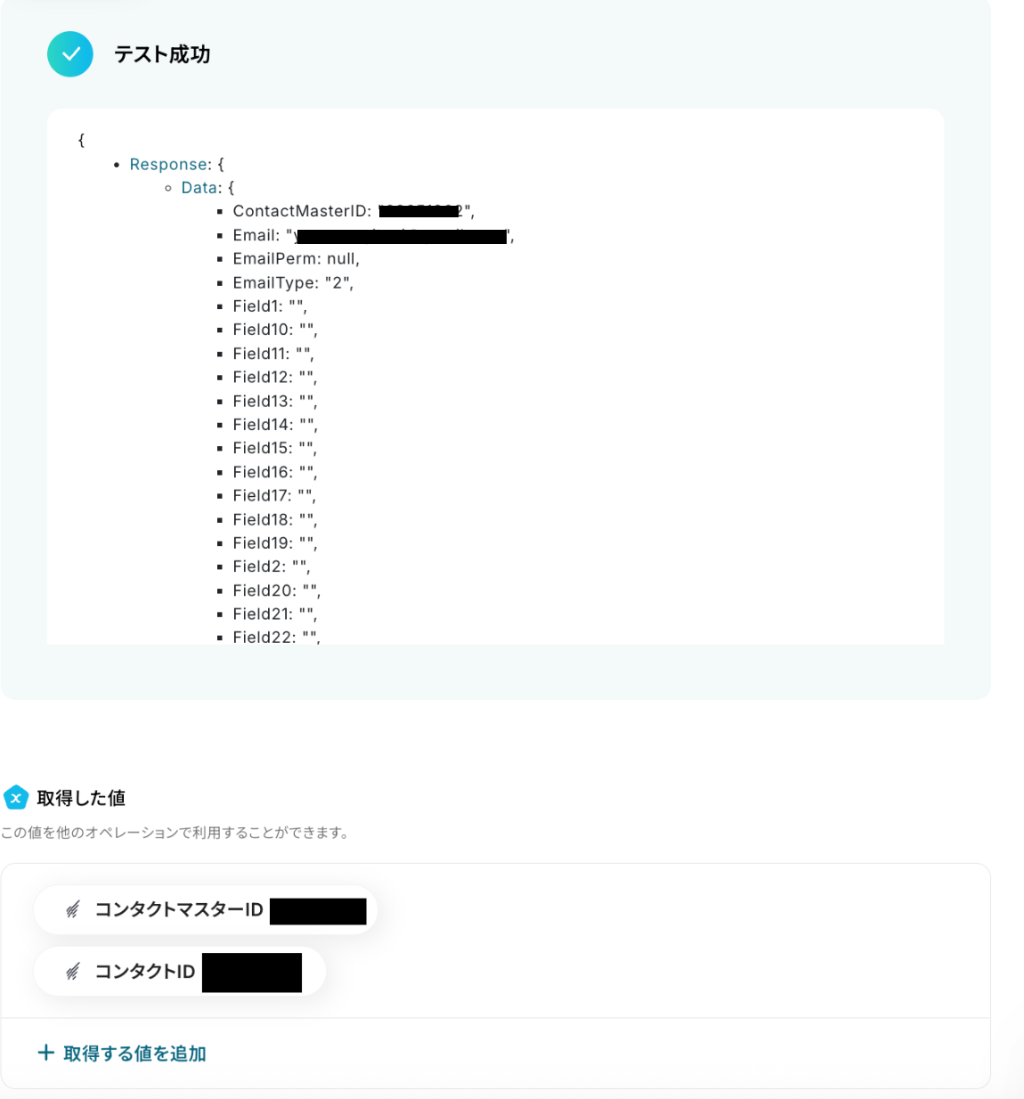 テストが成功すると、取得した値に情報が追加されます。