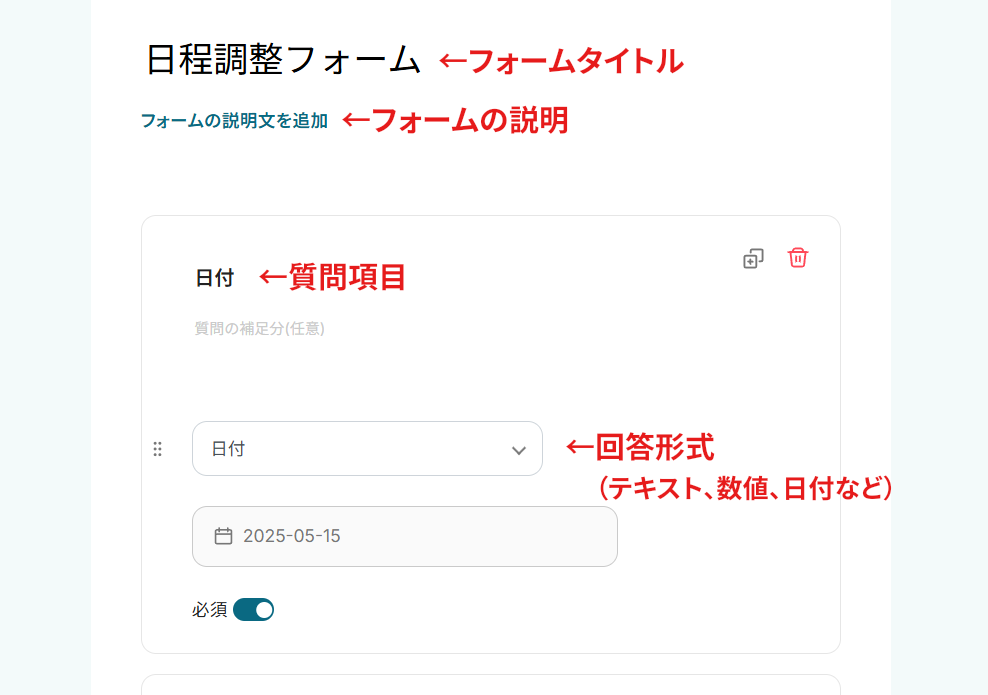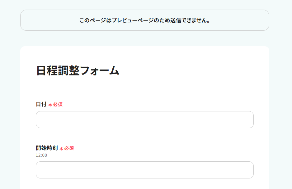 kintoneアプリのカレンダーに予定を追加するための質問項目(日付・開始時刻・終了時刻・予定タイトル・備考)がデフォルトで設定されています。 質問項目や補足は変更可能で、送信ボタン上のテキストや完了ページなども自由に設定できるので、運用方法に合わせて編集しましょう。 詳細はこちらのヘルプページ をご覧ください。