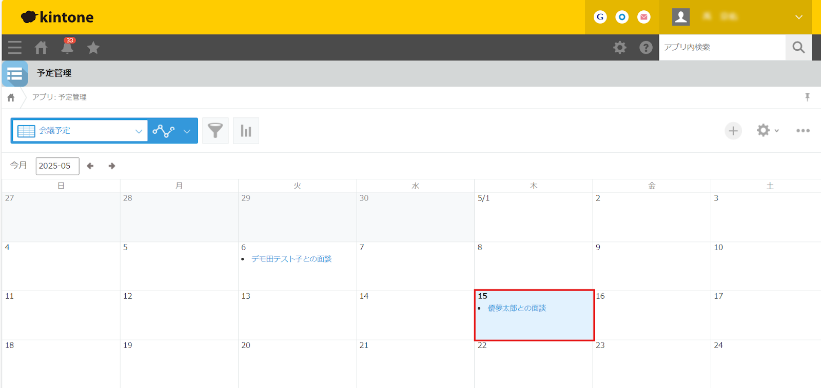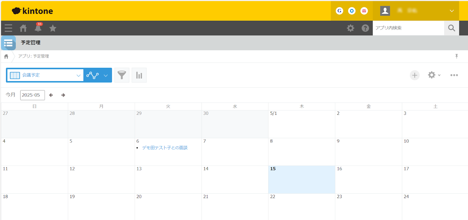 このフローでは、下図のようなkintoneアプリのカレンダーに予定を追加します。 アプリをカレンダー形式で表示する方法はkintoneのヘルプページ をご覧ください。