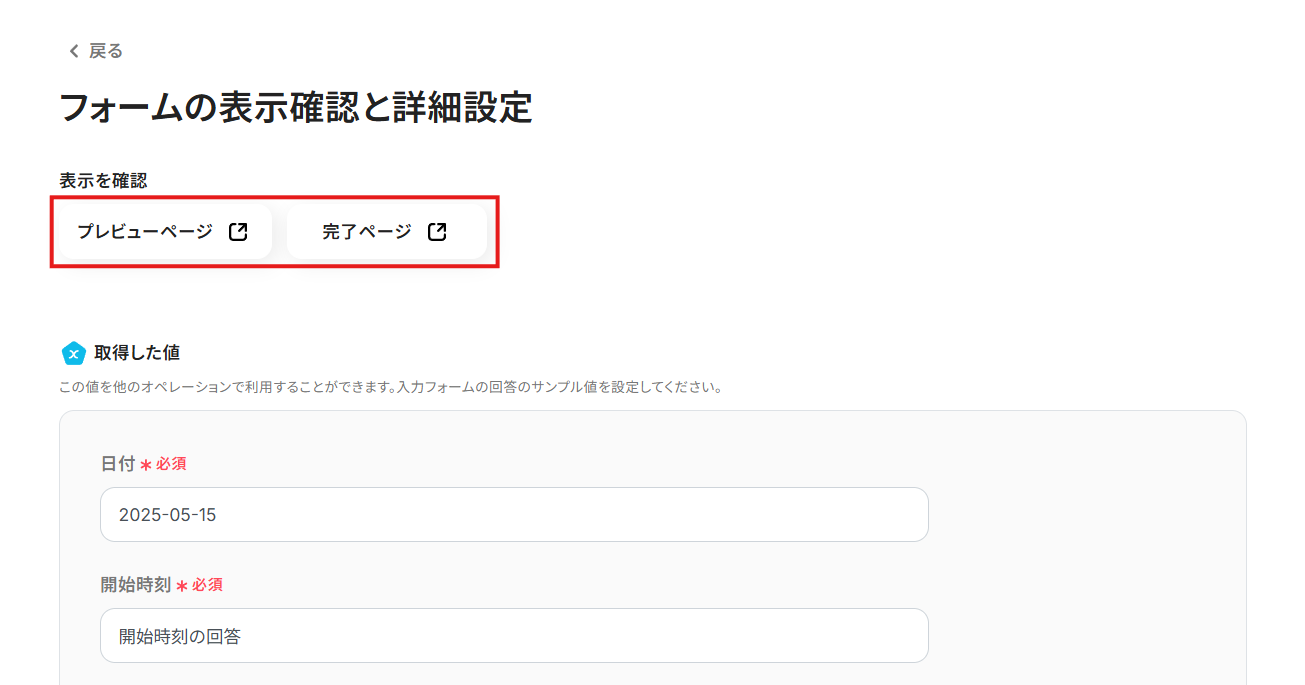 「プレビューページ」や「完了ページ」をクリックすると、作成したフォームや完了ページの表示を確認できます。