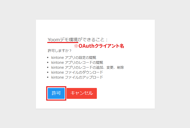 Yoomからkintoneへのアクセス権限を確認し、「許可」をクリックします。