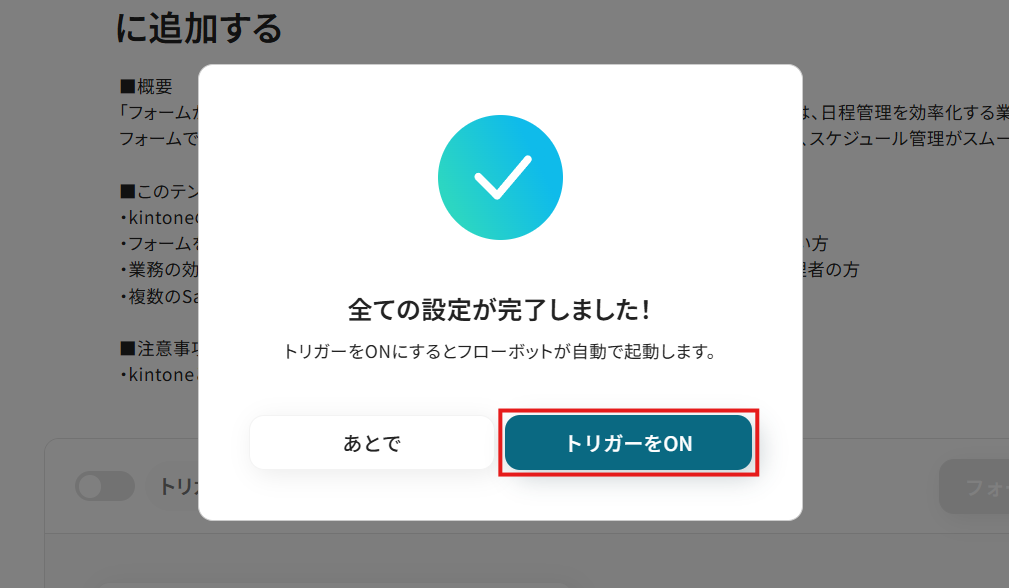 フロー画面に戻り、「全ての設定が完了しました!」と表示されていればフローの設定は完了です。 早速フローを稼働させるのであれば、「トリガーをON」をクリックします。