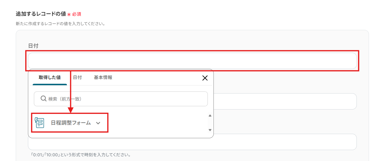 「取得した値」にテスト用のサンプル値を設定します。 ※ ここではサンプル値を手入力していますが、フローボットが実際に起動した際には、フォームの回答がカレンダーに追加されます。 ※ 時刻は「0:01」「10:00」という形式で設定してください。