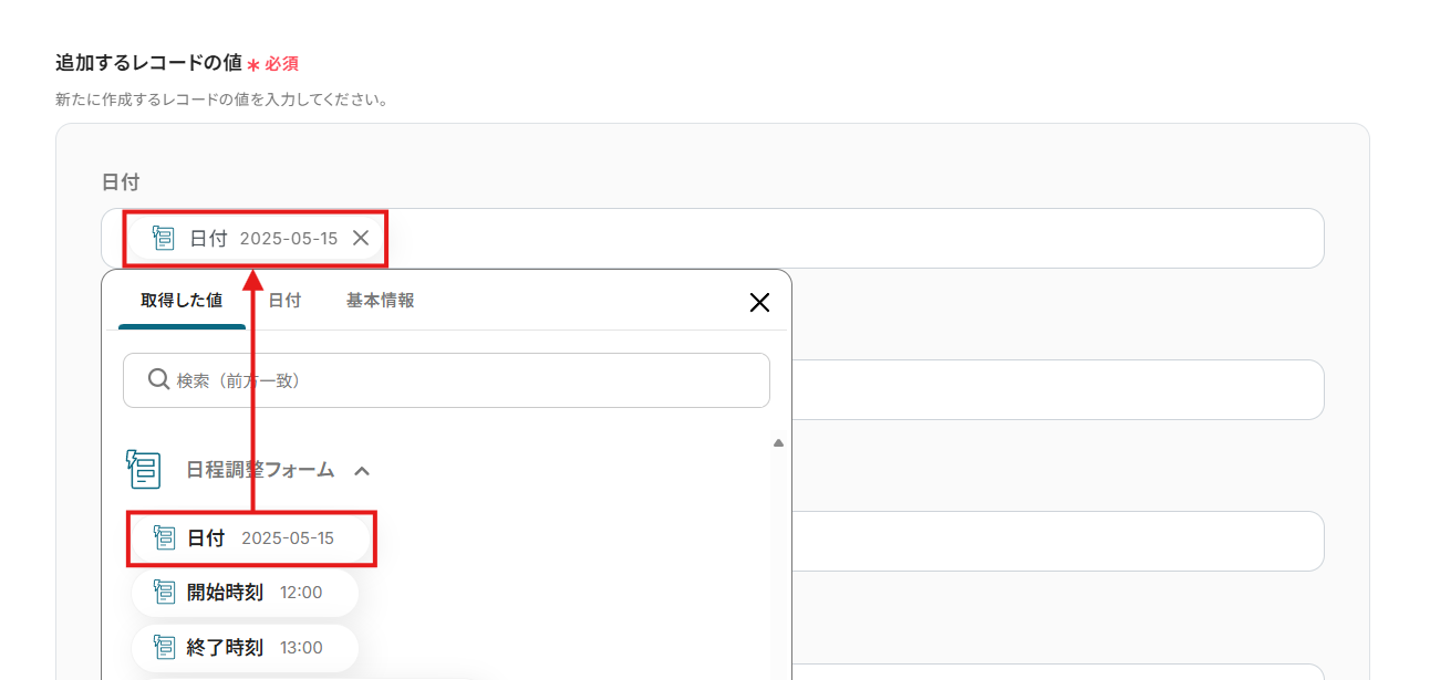 各項目にフォームから取得した値を設定していきましょう。 入力欄クリック時に表示されるフォームトリガーのメニューから、フォームの回答が選択可能です。 項目をクリックすると、入力欄に{{項目名 取得した値}}という形で追加されます。 このような「取得した値」は、フローが稼働する度に更新されます。 取得した値(アウトプット)についての詳しい説明は、こちらのヘルプページ をご覧ください。