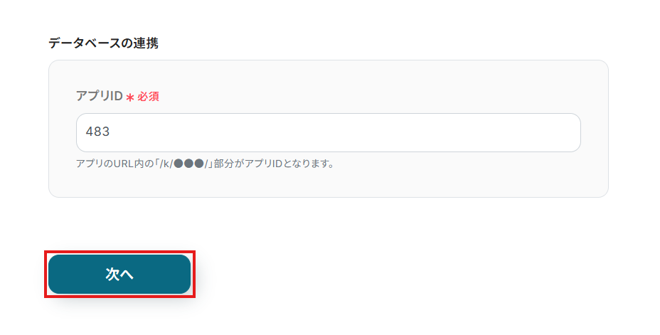 データベースの連携の「アプリID」に予定を追加するアプリのIDを設定。 アプリIDはkintoneのアプリURL(/k/{{ID部分}}/)で確認できます。