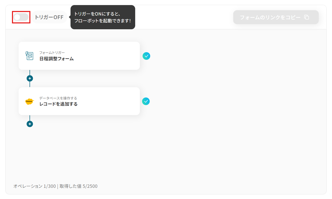 あとで稼働させる場合は、フロー画面のトリガースイッチをクリックすることで、トリガーをONにできます。