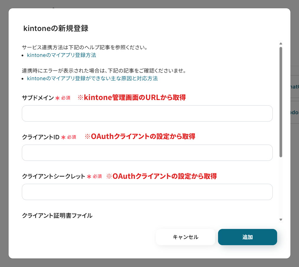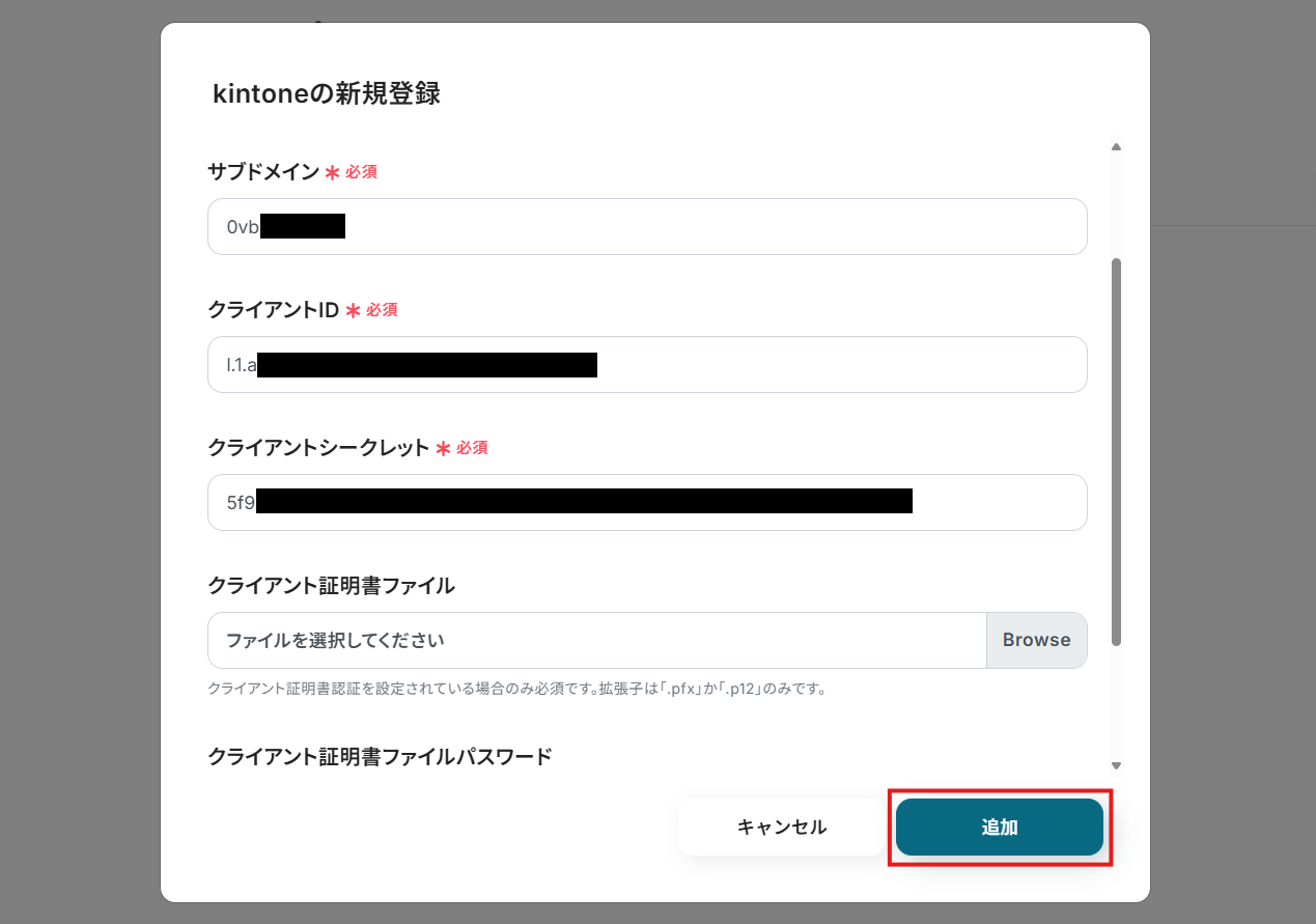 こちらの記事 を参考に、「サブドメイン」「クライアントID」「クライアントシークレット」をそれぞれ設定します。 ※ クライアント証明書認証を設定されている場合は、「クライアント証明書ファイル」と「クライアント証明書ファイルパスワード」の設定も必要です。