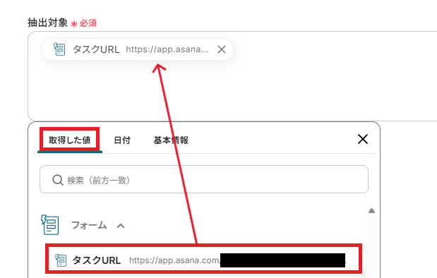 「抽出対象」には、フォームから取得したタスクURLを設定してください。