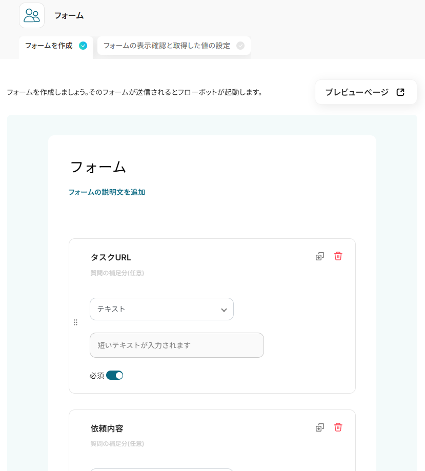 フォームは元から設定されており、タスクURLや依頼内容などが送信できるようになっています。