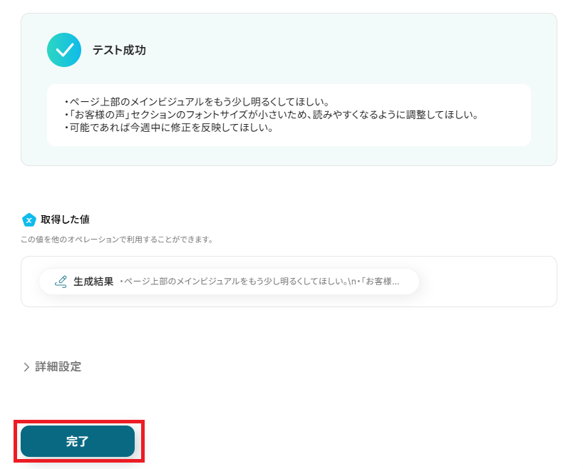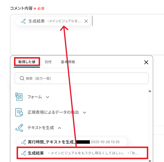 「コメント内容」も、取得した値から生成結果を選択し、設定してください。