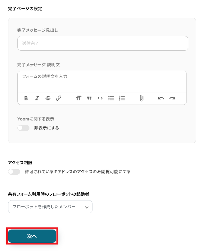 下へスクロールすると、「完了ページの設定」が表示されます。
