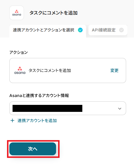 Asanaと連携するアカウントに間違いがないかを確認し、「次へ」をクリックしましょう。