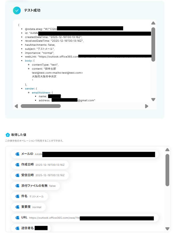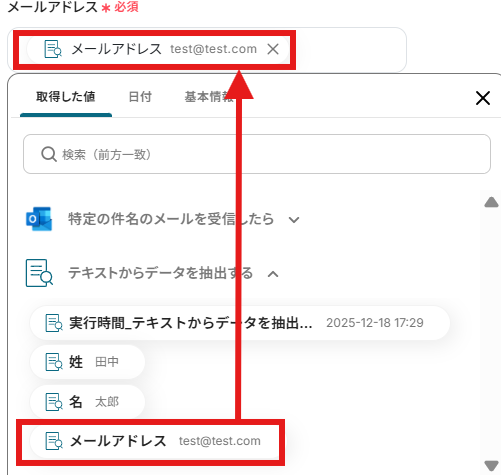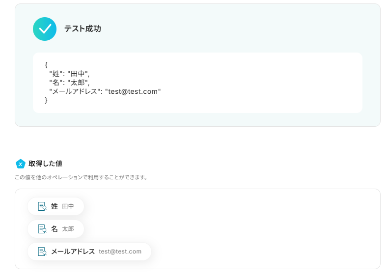 ※取得した値とは? 取得した値とは、トリガーやオペレーション設定時に、「テスト」を実行して取得した値のことを指します。 取得した値は、後続のオペレーション設定時の値として利用でき、フローボットを起動する度に、変動した値となります。詳しくは以下をご覧ください。
