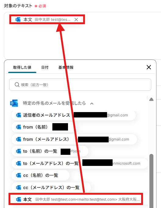 「対象のテキスト」は前のステップで受信したメールの本文を、取得した値から指定します。