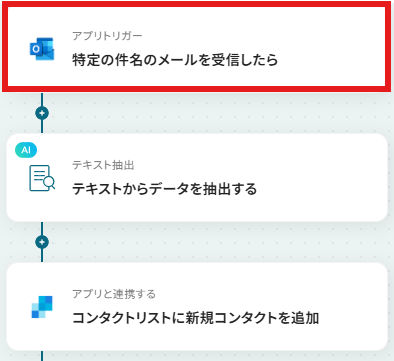 はじめに、OutlookとSendGridをYoomと連携します。 次に、トリガーでOutlookを選択し、「特定の件名のメールを受信したら」というアクションを設定し、対象とするメールの件名を指定します。 次に、オペレーションでAI機能の「テキストからデータを抽出する」アクションを設定し、Outlookで受信したメール本文からSendGridに登録したい情報(氏名、メールアドレスなど)を抽出するよう設定します。 最後に、オペレーションでSendGridの「コンタクトリストに新規コンタクトを追加」アクションを設定し、前段のAI機能で抽出した情報をマッピングして登録します。 ※「トリガー」:フロー起動のきっかけとなるアクション、「オペレーション」:トリガー起動後、フロー内で処理を行うアクション