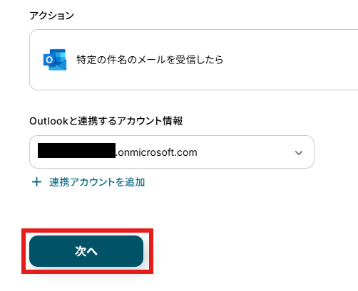 アクションはデフォルト設定のまま、アカウント情報は、連携したいアカウントが選択されているか確認してください。確認出来たら「次へ」をクリックしましょう。