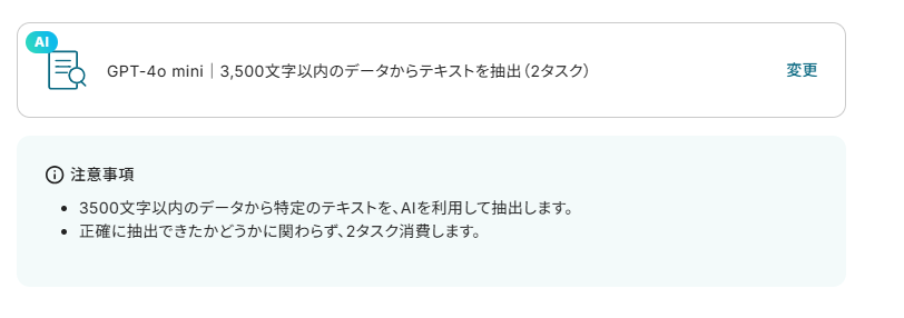 今回使うのは「GPT-4o mini|3,500文字以内のデータからテキストを抽出(2タスク)」です。文章量などによってこちらは適宜変更してください。