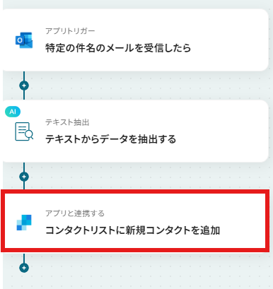 AI機能の「テキストからデータを抽出する」オペレーションでは、Outlookのメール本文のどの部分から、どのような情報(例:氏名、会社名、電話番号など)を抽出するかを、SendGridに追加したいコンタクト情報に合わせて柔軟に設定することが可能です。 SendGridの「コンタクトリストに新規コンタクトを追加」オペレーションでは、リストIDに特定の値を固定で入力したり、トリガーや前段のAI機能で取得した顧客名やメールアドレスといったデータを動的な値として埋め込んだりするなど、登録する情報を自由にカスタマイズできます。 ■注意事項