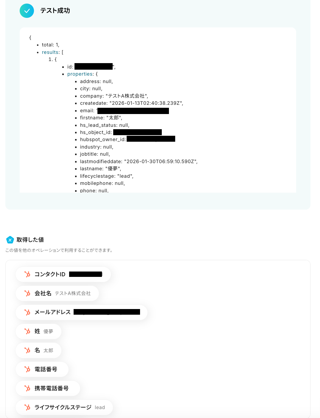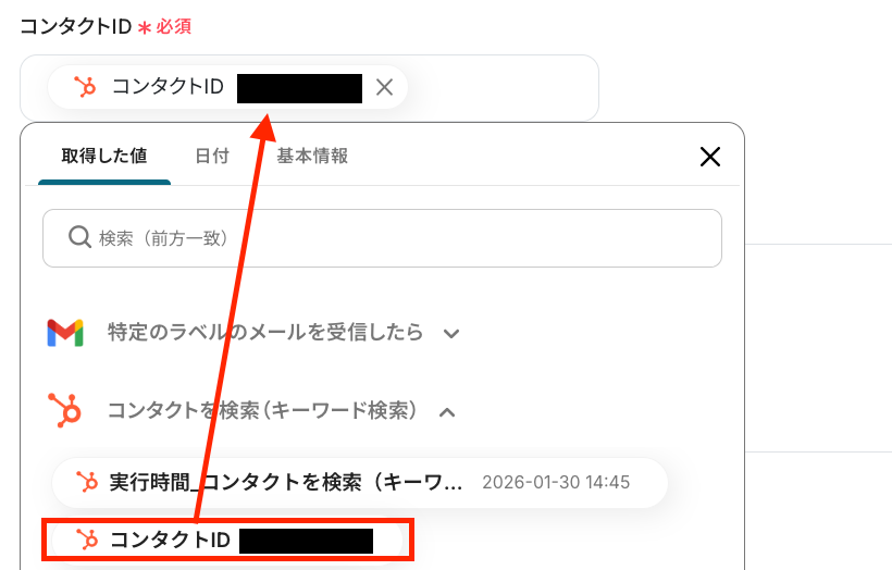 「コンタクトID」は、「ステップ4:HubSpotの設定」で取得した値から選択してください。