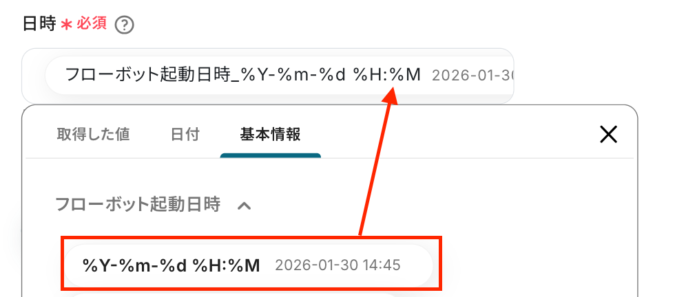「日時」は、入力欄をクリックして「基本情報」→「フローボット起動日時」をクリックして選択してください。
