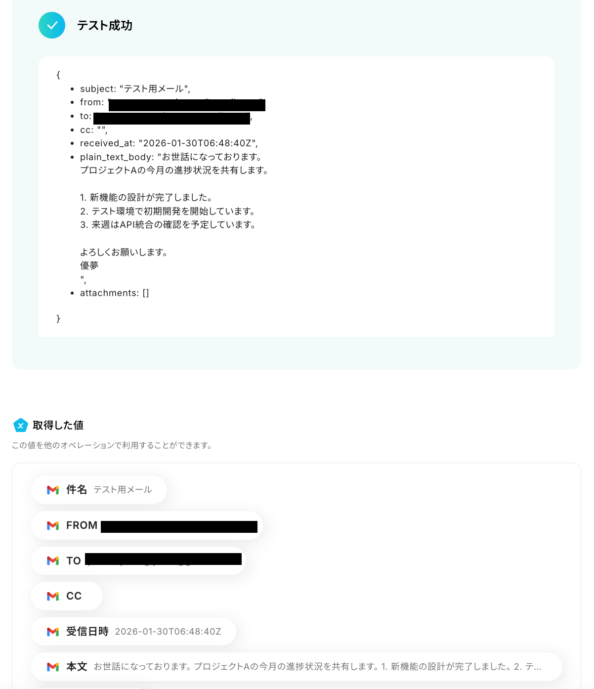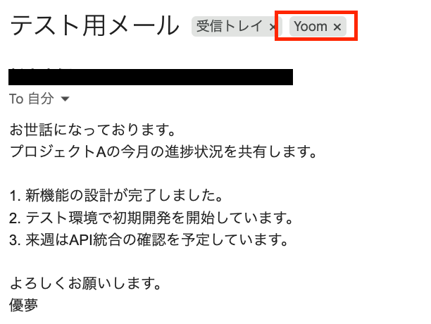 今回は、特定のラベルが付いたメールがトリガーになるため、ラベルの付いたメールをテスト送信してください!