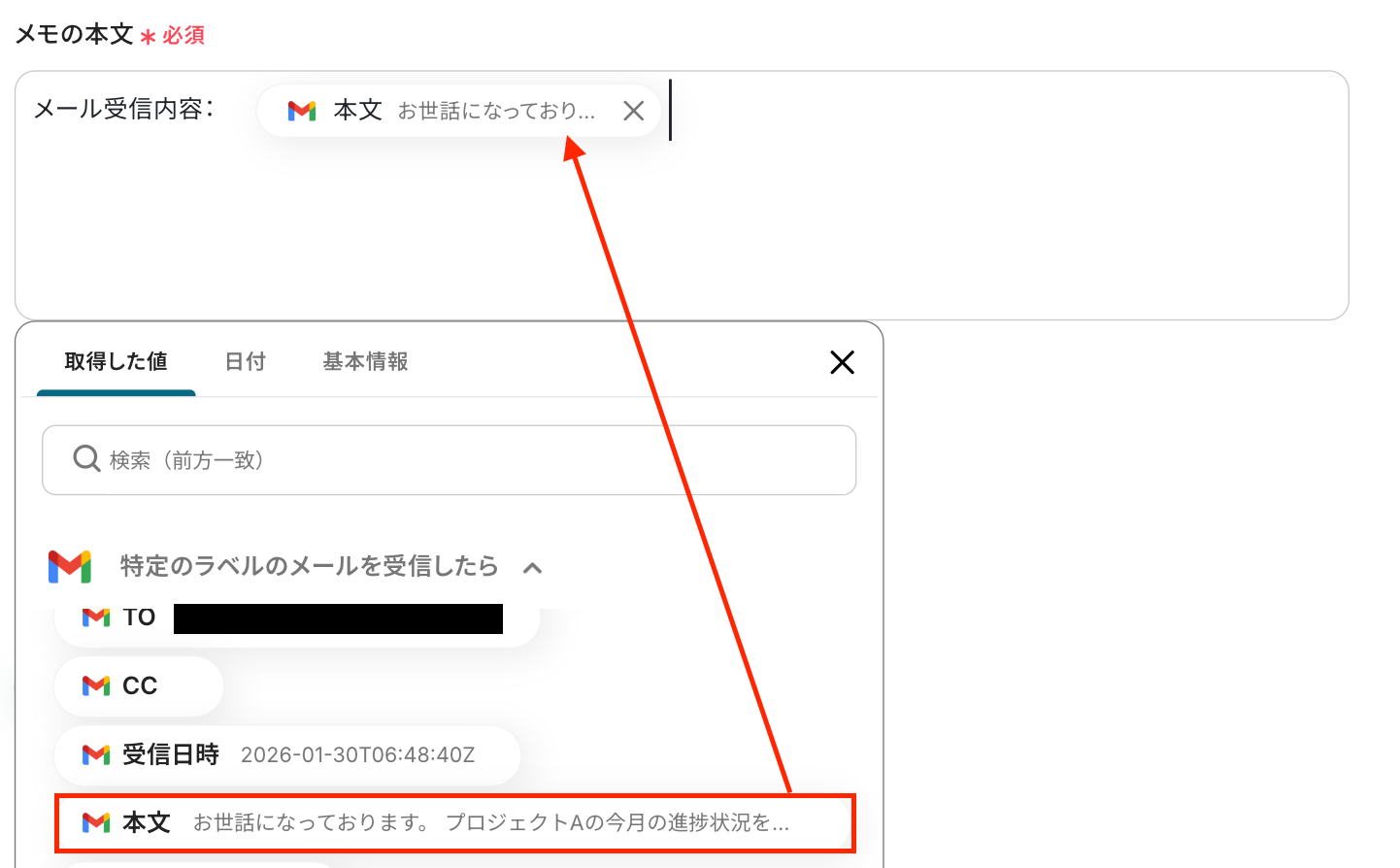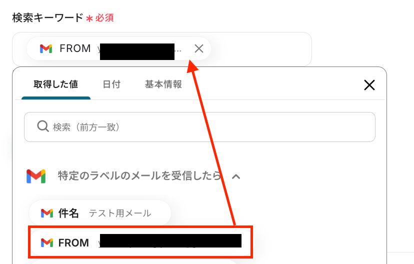 「検索キーワード」は、Gmailのトリガー設定で取得した値を引用してください。