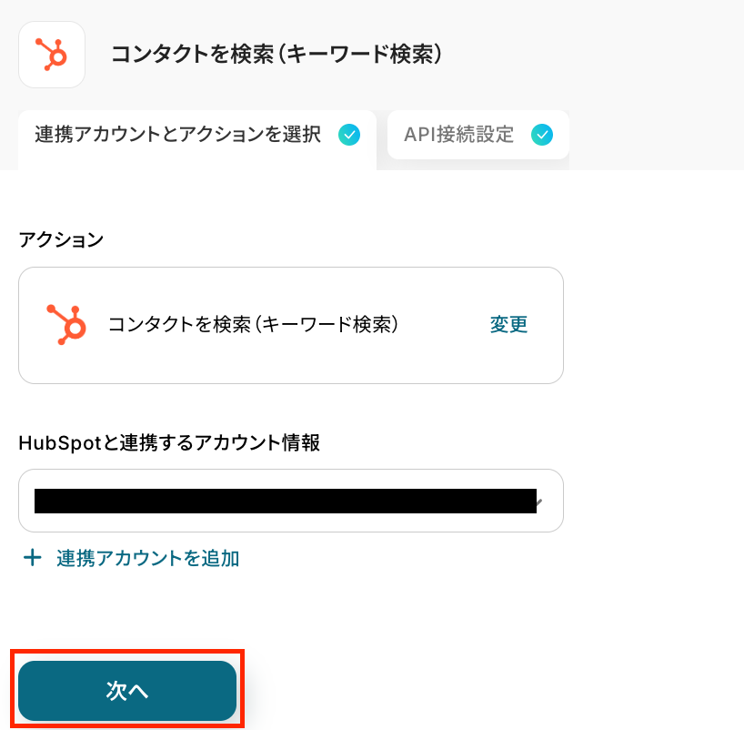 ここでは、HubSpotのコンタクトを検索する設定を行います。