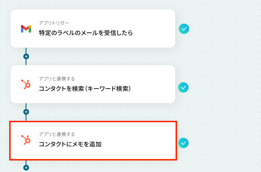 ここでは、既存コンタクトから受信したメール内容をHubSpotのメモに追加する設定を行います。