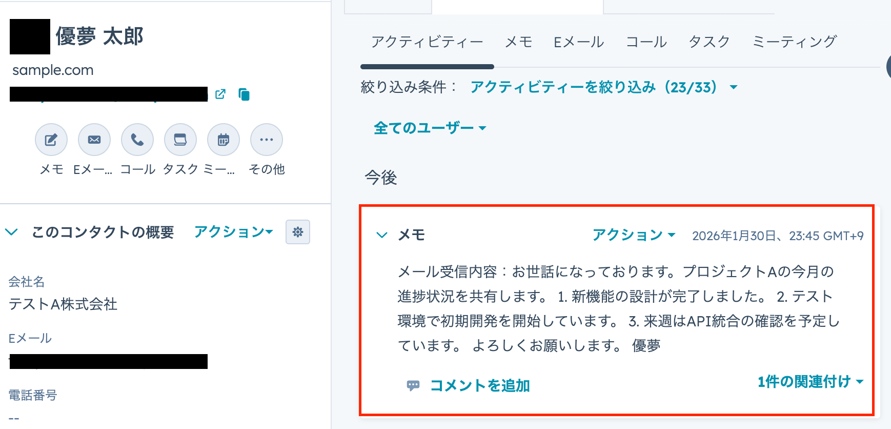 HubSpotの該当のコンタクトにメモが追加されましたね!