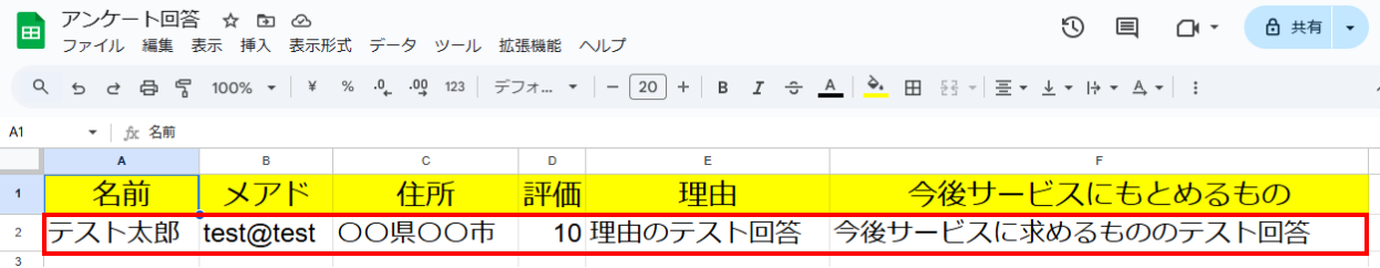 テストが成功すると、指定したGoogle スプレッドシートにレコードが追加されているはずなので確認してみましょう。