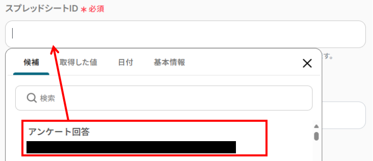 ・スプレッドシートID:欄をクリックし、候補から事前に用意したスプレッドシートを選択します。