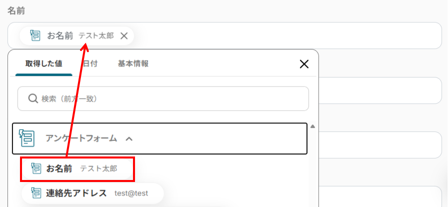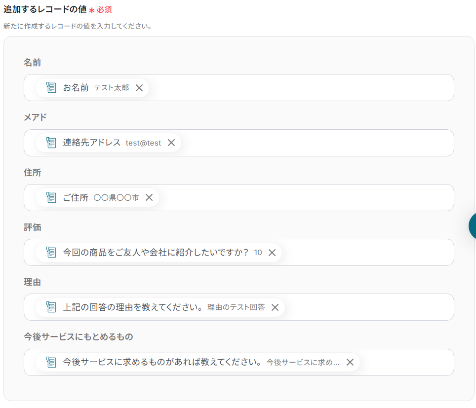 「追加するレコードの値」について、それぞれの入力欄をクリックすると、下記のようなアウトプットが表示されます。アウトプットを活用し、フォームの回答を選択しましょう。