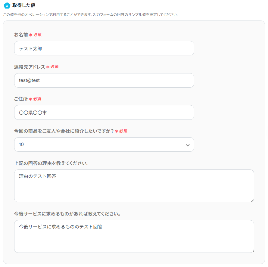 今回は、下記のような内容で入力しました。お名前、アドレスなどが質問項目で、それらのボックス内にあるテキストがサンプル回答データとなります。